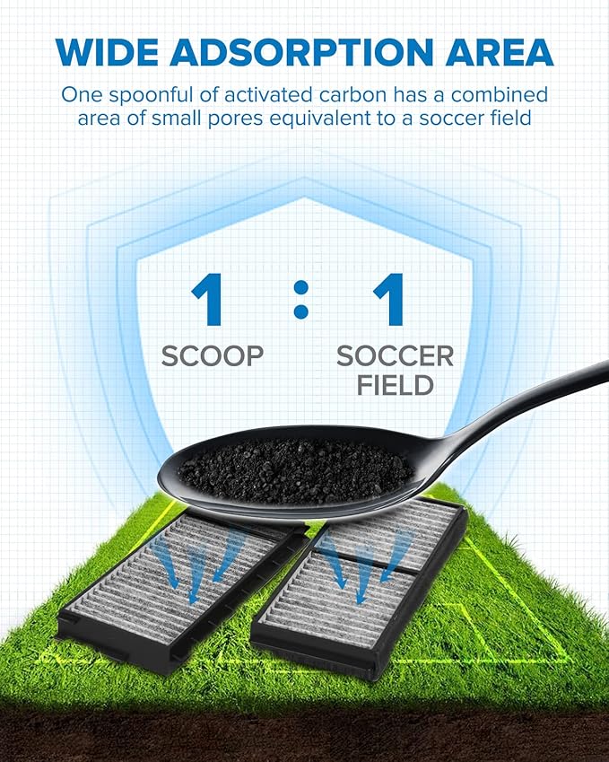 - Enjoy Fresh Air: Activated carbon cabin air filter quickly adsorbs unpleasant odors from outside the ventilation system, provides a more comfortable interior environment for the driver and passengers without adding chemical odor neutralizer