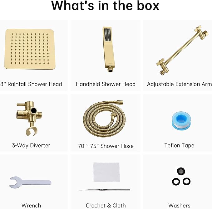 - ►PACKAGE INCLUDES: Rainfall shower head, handheld shower head, shower extension arm, shower hose, shower diverter and accessories