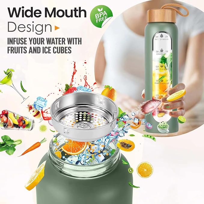 Aqulea Glass Water Bottles 32 Oz with Silicone Sleeve - BPA Free Reusable Wide Mouth Glass Motivational Water Bottles with Fruit Infuser – Leak Proof Borosilicate Water Bottle with Time Marker (Green)