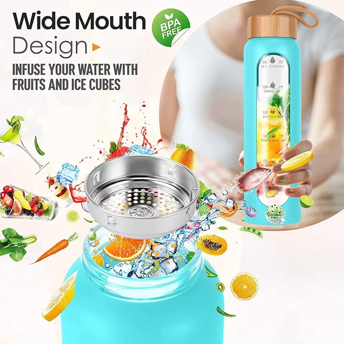 - Innovative and Convenient: The Aqulea wide mouth water bottle glass package comes with a leak-proof glass bottle with bamboo lid, a non-slip protective silicone sleeve for easy grip and maximum impact protection, an 18/8 stainless steel strainer for infusion water bottle, and a retractable brush