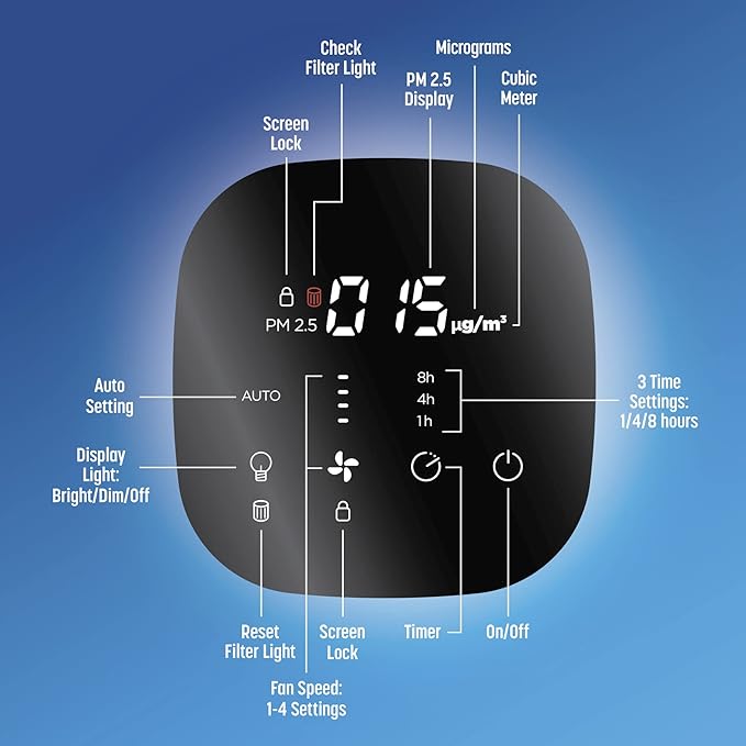 - ACCURATE AIR-QUALITY FEEDBACK. The air quality sensor provides real-time feedback with a PM2.5 digital display, a color-coded light from green/good to maroon/hazardous and by automatically adjusting the auto mode's fan speed in response to changes in the current air quality.