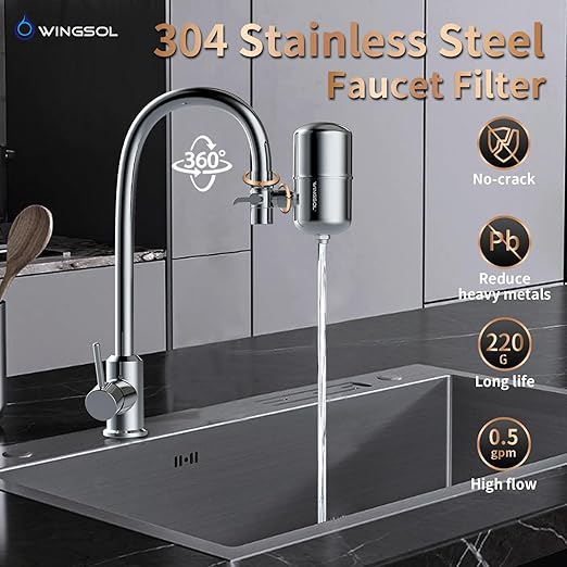 WINGSOL Faucet Filter Reduce Heavy Metals 99.6% Lead, Increase Water pH & Taste NSF/ANSI 42&53, 304 Stainless-Steel 220-Gallon 0.1µm Remineralize Water 5-in-1 Function WS-FM001-5in1