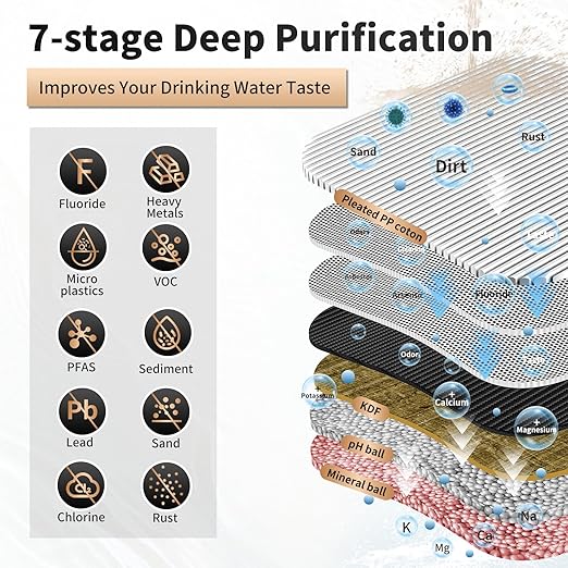- [2-Stage 7-Layer Filtration]: The under sink water filtration system reduces 99.99% Lead, Chlorine, Odor, Sand, Rust, Benzene, Cyst, P-Dichlorobenzene, Asbestos, MTBE, TTHM, VOC, Turbidity, etc.; Fit for both municipal water and well water; ★NOT for reducing TDS★