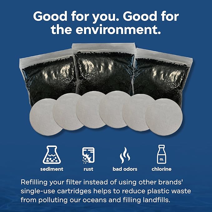 - Material Carbon,Coconut Shell,Plastic : Included Components 3 Carbon Filtration Filter Refill Packs, 6 Sediment Filter Discs (2 used per Refill), Filter Refill Instructions 3 Carbon Filtration Filter Refill Packs, 6 Sediment Filter Discs (2 used per Refi… See more