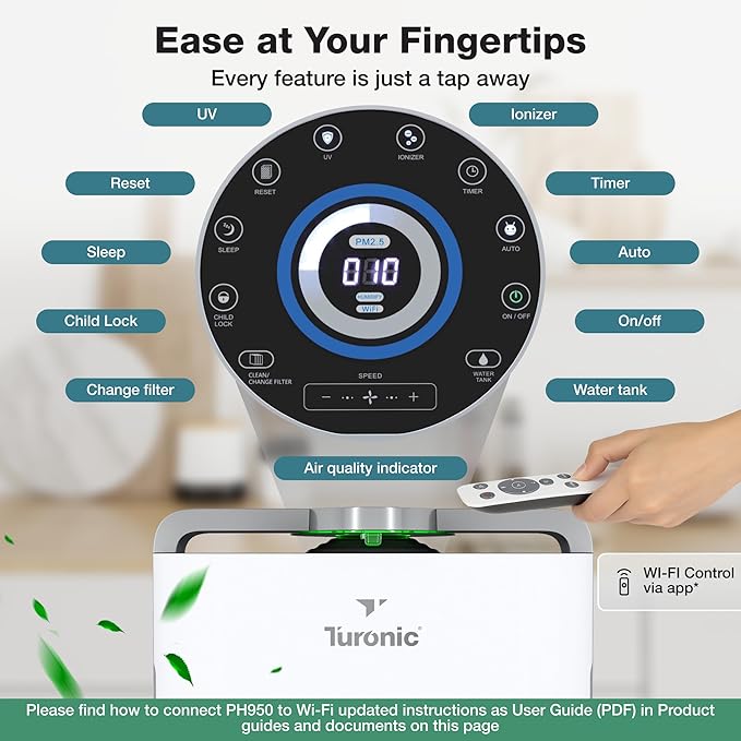 Turonic PH950 Air Purifier and Humidifier Combo for Large Rooms – HEPA, UV, Ionizer, PM2.5 Sensor, Cold Catalyst – Air Purifier for Home Pets with 8 Speeds, App Control, Remote, Filters, Humidifier