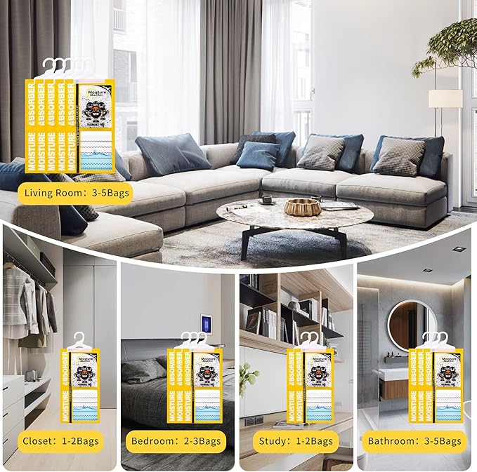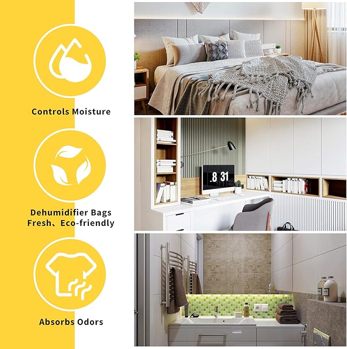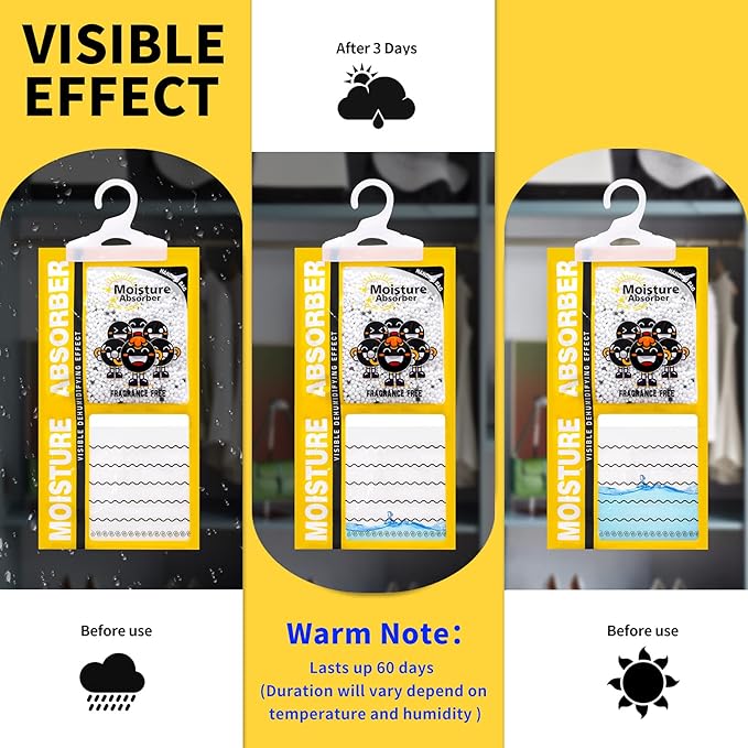 - 🌱❤Clever Design:The upper part of the moisture absorber uses pure white DuPont paper, and the lower part is a transparent bag, so that it looks clean and tidy, and the entire water absorption process is clearly . Lasts up to 60 days (Duration will vary depending on temperature and humidity) .