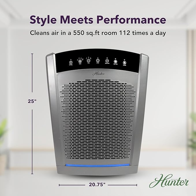 - QUIET OPERATION: Hunter air purifiers for bedroom feature a sleep mode with quiet operation at only 37 decibels, ensuring restful sleep without typical air purifier sounds. The bedroom air purifier also features a sleep timer with 3 intervals up to 8 hours. Ideal for bedroom, office, living room.