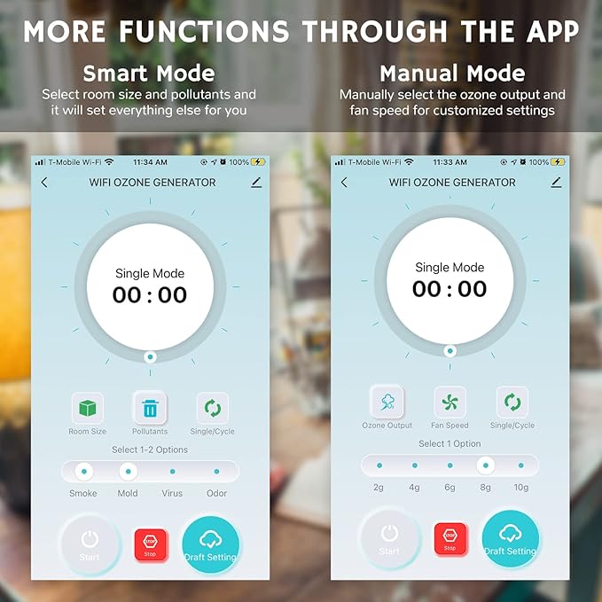 - TWO MODES OPTIONAL: Use the smart mode to automatically adjust the settings or use the manual mode to adjust it yourself. Set the timer and adjust the ozone output once the room is unoccupied.