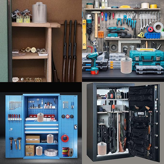 - 【Versatile】: Silica gel container can Protects up to 560 cubic ft of enclosed storage space., including safes, ammo cans, toolboxes, 3D printer filament storage boxes, weapon cases, and closets. It provides an effective solution for moisture prevention in various items such as guns, important papers, legal documents, collectibles, books, jewelry, photo albums, shoes, camera lenses, valuable camera equipment, toys, leather clothing, ammunition, and photographic gear.