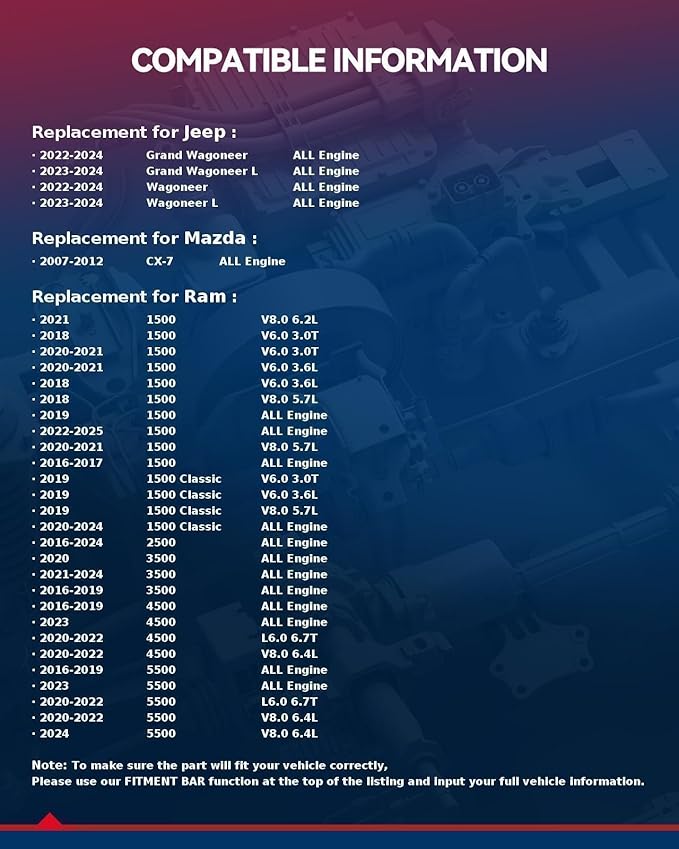 - Compatible List: Replace part#CF11671, CX7 (2007-2012), RAM1500 (2016-2023), 1500 CLASS (2019-2023), 2500 (2016-2023), 3500 (2016-2023), 4500 (2016-2020), 5500 (2016-2020). [Please use the fitment system to confirm if it matches your vehicle before purchase]
