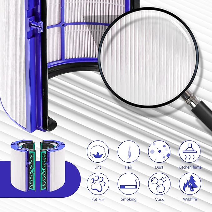 - UPGRADED MATERIAL: The 360° combi glass tp04 dp04 hepa filter replacements is made of upgraded hepa h13 / merv 17 material, ensure strong efficiency for purifying air indoor and high-quality air purifier filter replacement is an ideal choice for there are smokers, air pollution and open layout kitchens in your house