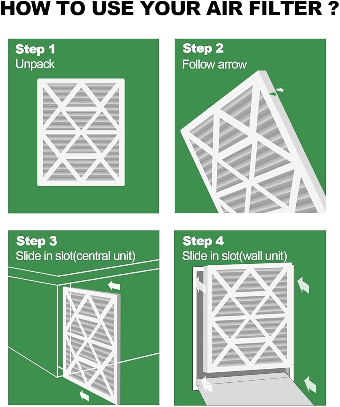 - Easy to Use: Installing or replacing our air filters for AC units or furnace is as simple as it gets. First, you need to turn off your stove, and then Simply slide the filter into the air filter return device as indicated by the arrow to done! For best results, change your filters every 60 to 90 days but increase frequency to 30 days during peak summer and winter months
