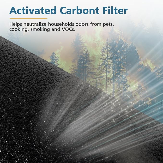 - 【4 STAGE OF FILTRATION】Our filter adopts 4-stage HEPA filtration technology, which has stronger filtration effect on ultra-fine suspended below 0.3um. The Pre-Filter, High-density Cloth Filter, HEPA Filter and Activated Carbon Filter work together to reduce airborne particles and unwanted odors in your living space to providing you with the freshest, cleanest air your lungs could ever want.