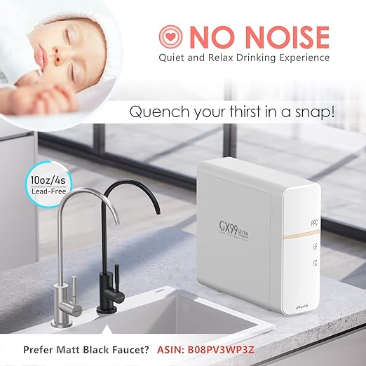 - 【Integrated Waterway & Super Compact Design】As an all-in-one under counter filtration system, GX99 adopts integrated waterway technology, which greatly cuts down the risks of water leakage. Less tubing connection points, less leaking concern! GX99 3-stage water filter features with super compact and tankless design, the small footprint saves more than 80% of storage space under the kitchen sink.