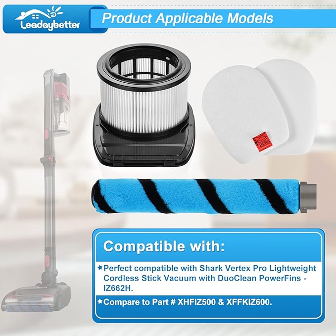 Leadaybetter Filter Replacement for Shark IZ662H Vertex Pro Lightweight Cordless Stick Vacuum with DuoClean PowerFins, 2 HEPA Filters, 1 Soft Roller, Compare to Prat XHFIZ500 & XFFKIZ600 & 855FFJ362H
