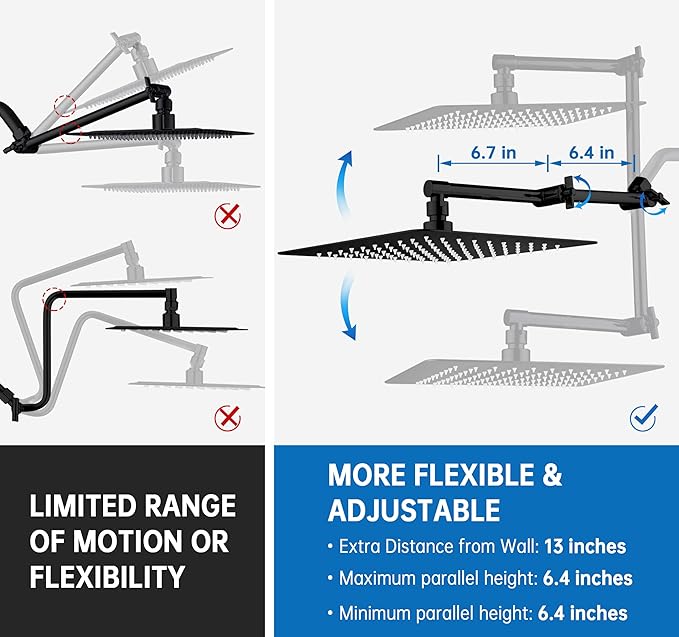 - FLEXIBLE EXTENSION ARM PATENTED DESIGN: The length of 13 inch avoid the trouble of being too close to the wall when showering. Two knobs allows you choose any height and angles you need. Easily tightened