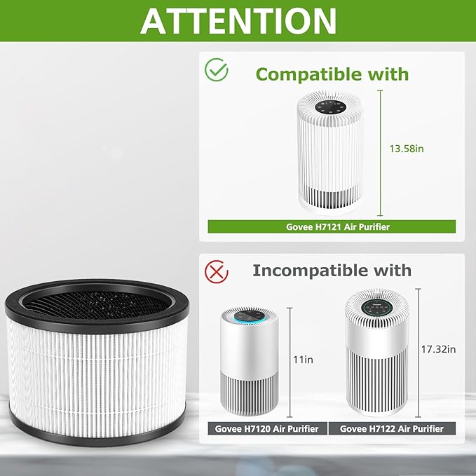 - 【NOTE】: Our H7121101 replacement filter is not compatible with Govee H7120 and not compatible with Govee h7122. Please kindly check your model before placing the order