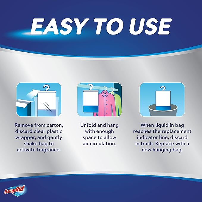 - LONG-LASTING FRESHNESS: DampRid hanging bag moisture absorbers can last up to 60 days depending on temperature and humidity. They're ideal for closets to protect your clothes and leather goods from musty odors and moisture damage.