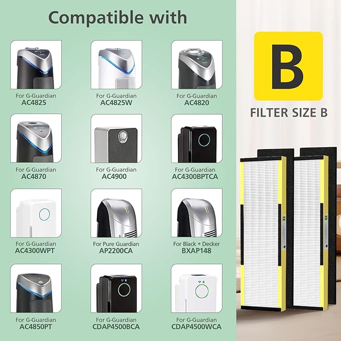 - FLT4825 hepa filter b replacement Compatible with Guardian air purifier models: FLT4825 Filter B, AC4300BPTCA, AC4900CA, AC4825, AC4825E, AC4850PT, AC4900CA, AC4820, and compatible with PureGuardian Model AP2200CA and compatible with Black+Decker BXAP148.