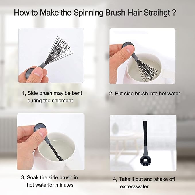 - Tips: If the side brushes are bent or curled due to shipping, please recover them by simply soaking them in warm water for several minutes. It will not affect the quality and performance