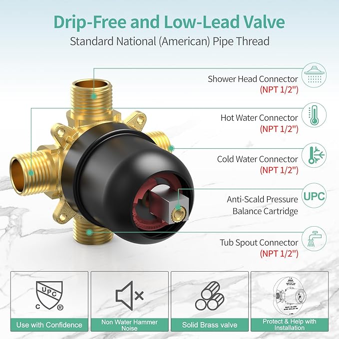 - Prevent Water Hammer: This pressure balance valve has built-in two check valves to effectively eliminate water hammer noise. Pressure balance valve's cartridge monitor water pressure balance, helping to protect you from being scalded by sudden changes in hot or cold water pressure.