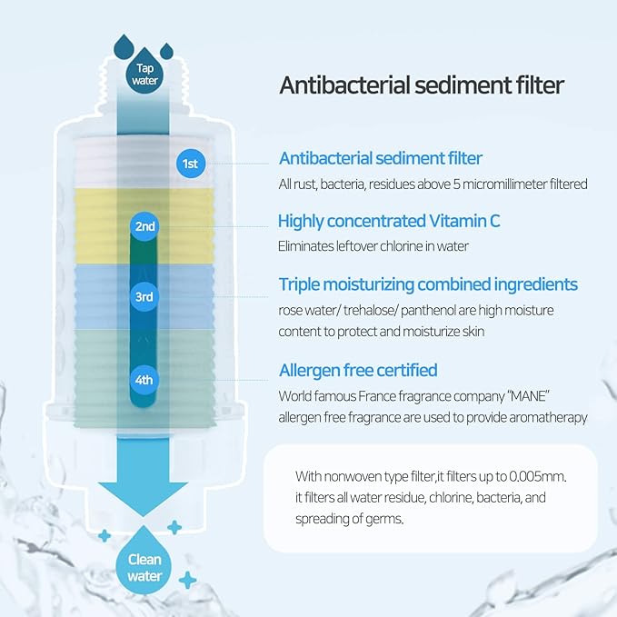 - [Powerful Sediment Filter] Premium, high density shower filter traps impurities while a Vitamin C infusion neutralizes chlorine and other chloramines to ensure skin and hair stay hydrated and healthy. Glowing, healthy skin and hair after every shower.