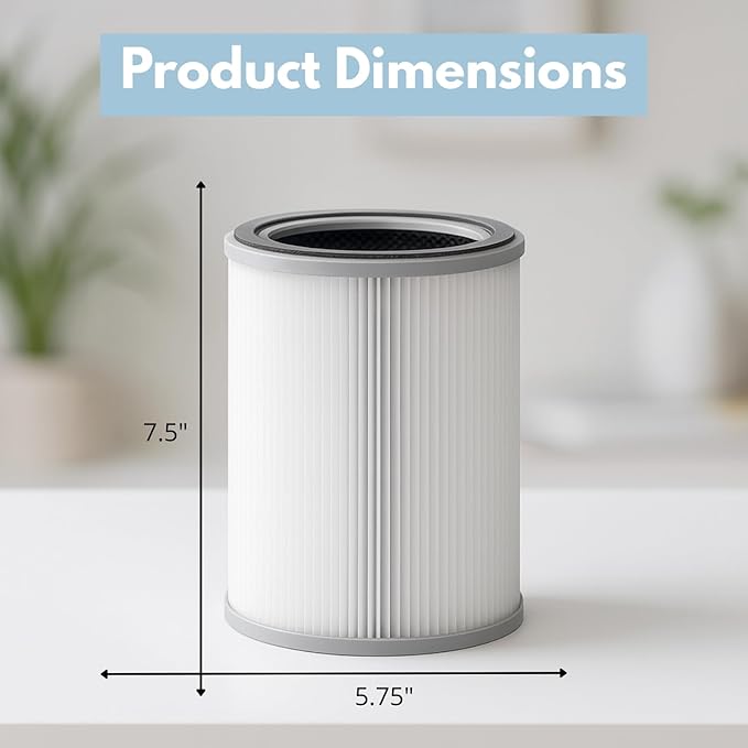 - Filter size dimension: 5.75 x 5.75 x 7.5 inches.