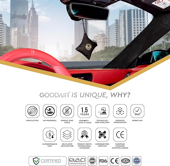 - ● Doctor-Recommended Car Air Purifier: The GOODAIR Royal Premium 75g Activated Carbon Car Air Purifier is a doctor-recommended solution for naturally eliminating smoke, pet odors and food smells in your car. Unlike traditional air fresheners, it purifies the air without the use of harmful chemicals or electricity, providing a clean, safe, and chemical-free environment for you and your passengers.