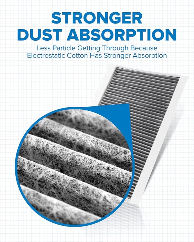 - Enhances HVAC Performance: The special structure of the long-fiber layer electrostatic cotton makes the dust-holding area times higher than other flat materials, with enough gaps for air passage to improve the heating and cooling efficiency of HVAC and prevent musty odors from forming inside the car