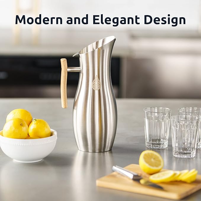 - ELEGANT STAINLESS STEEL PITCHER - Built from durable stainless steel, our metal water pitcher stands out from the crowd. With a minimalistic design, elegant curves and a wooden handle, this pitcher is sure to leave a lasting impression.