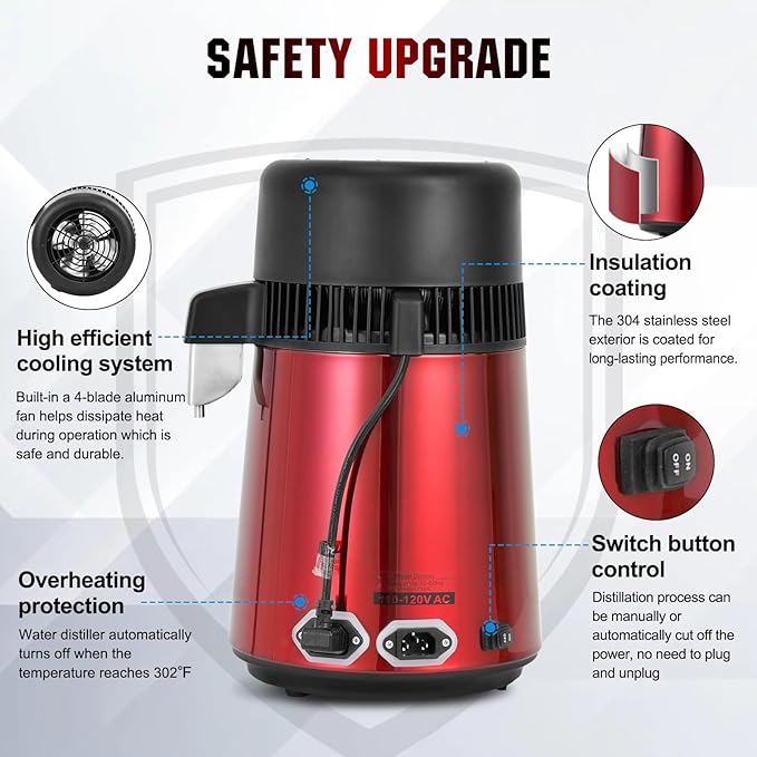- [Safety & Upgrade] When the temperature reaches 320°F, this distiller will automatically shut down to effectively prevent overheating; Our water distiller has an additional on/off switch on the basis of the reset button, and the distillation process can be manually or automatically cut off the power without plugging and unplugging