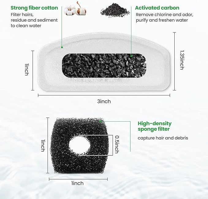 - Freshen Water for Pets: Cat water fountain filters has 3 layer filtration system, first high density cotton mesh layer fliter hairs and residue, keep water clean; Second activated carbon powder layer remove chlorine and odor, purify and freshen water; Third natural ion-exchange resin, can remove heavy metals ions and improve the taste, keep fresh and healthy water for your pets