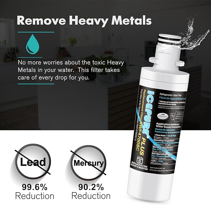 - NSF/ANSI 53 Certified- Tested and certified by IAPMO against NSF/ANSI 53 to reduce 98.88% Lead, 99.99% Cyst. ICEPURE PRO filter takes out toxic Lead and Mercury from your drinking water