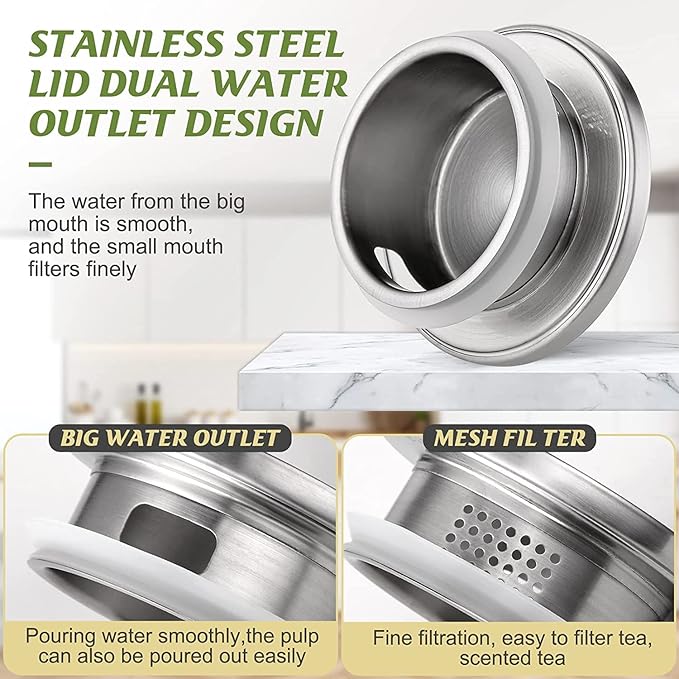 - 【MULTIFUNCTIONAL LID】The lid has two openings, which can be turned to pour water or the other side to filter beverages. The soft silicone seal keeps the lid firmly on the lid to prevent leakage.