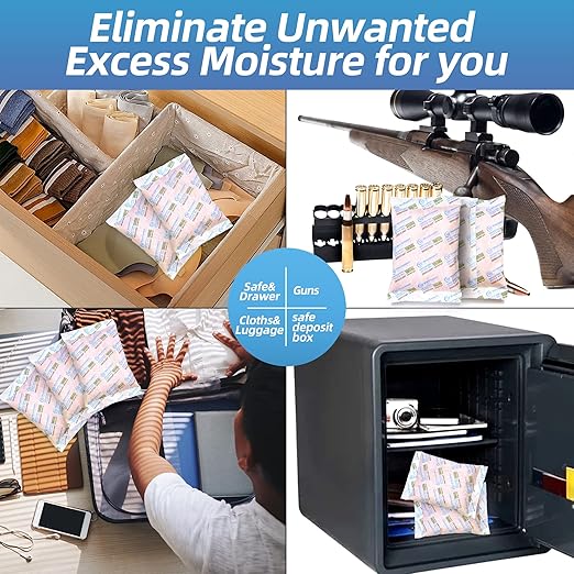 - 【Widely Used】: The silica gel desiccant packets provide a better solution keep moisture from guns, important papers, legal papers, collectibles, books, jewelry, photo album, shoes, camera lens, toys, leather clothing, ammo, photo equipment,etc. This type of desiccant is also widely used in mental processing, machine manufacturing and electric manufacturing industries.