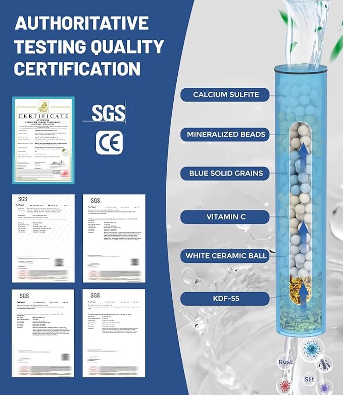 - Pure-clean Protection: This filtered handheld showerhead consists of KDF-55, calcium sulfite, blue solid grains, vitamin C, mineralized beads & white ceramic beads. Especially the much more premium KDF-55 included in our showerhead comparing to other normal shower filters, effectively removes chlorine to improve the condition of your skin, nails and hair