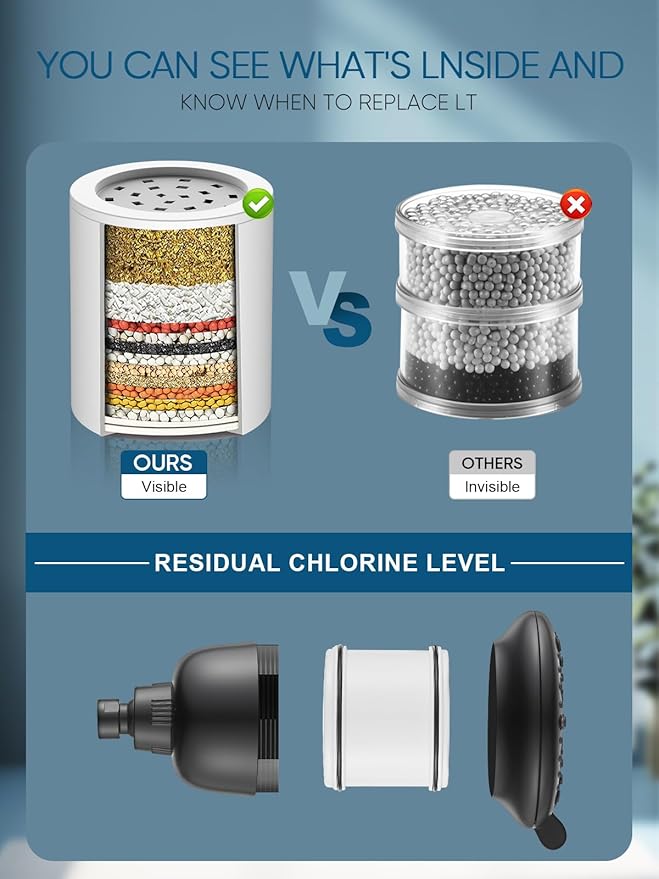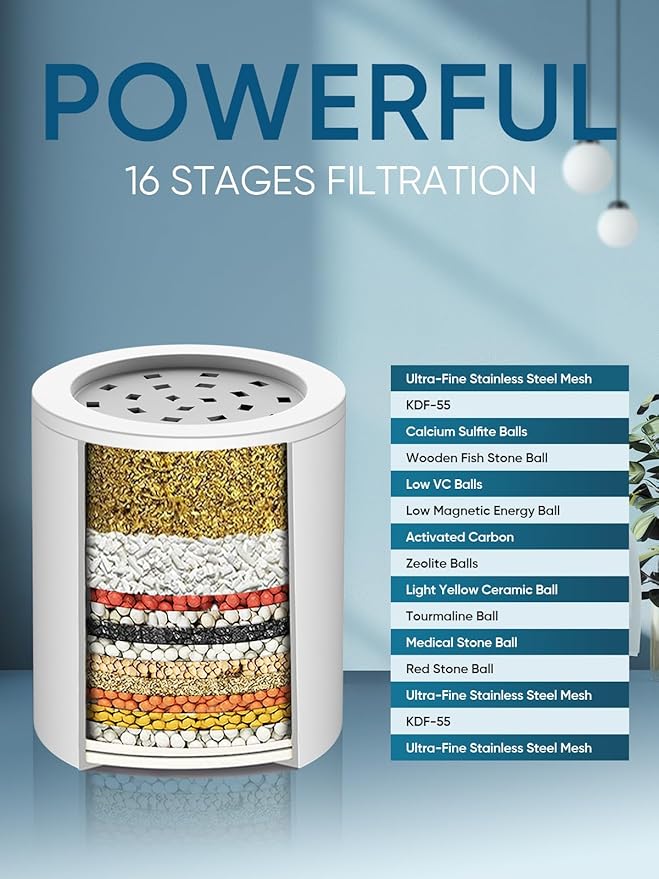 - 【16 Stage Shower Filter】16-stage filter adopts KDF-55, Calcium Sulfite, Vitamin C Balls, Acid-washed active carbon, Negative Ion Balls, Defluoride Particles and other filtering materials, ensure maximum reduction of Chlorine, heavy metals (lead, mercury, nickel, chromium) and other harmful substance in your shower water.Soften water quality, providing you with the cleanest and most comfortable water flow.
