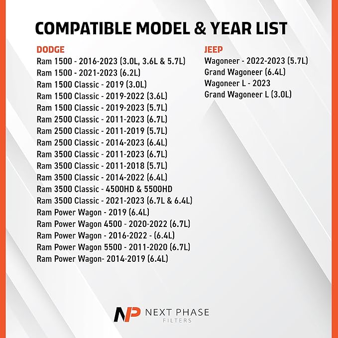 - Pack of 1 Cabin Air Filter Replacement - Compatible with - Various Dodge Ram 4000, 3500HD Chassis Cab, Ram 4500 & Ram 5500, Ram 1500, 2500, 3500, Ram Power Wagon, 1500 Classic; Jeep Wagoneer & Grand Wagoneer, Wagoneer L & Grand Wagoneer L; Mazda 6, CX-7, and Mercedes Benz E63 AMG. Our cabin filters are designed to fit perfectly in your vehicle. Next Phase NP25858 replaces O.E. 68406048AA, 68318365AA; Wix 24579, Purolator C25858, Fram CF11671, Champ CAF1864P.
