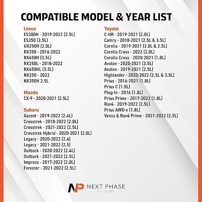 - Pack of 1 Cabin Filter - For Carbon Upgrade use NP21471. Compatible with various Lexus models; Subaru Ascent, Crosstrek, Crosstrek Hybrid, Legacy, Outback, Impreza, Forester; Toyota C-HR, Camry, Corolla, Corolla Cross, Avalon, Highlander, Prius/Plug-In/Prius Prime/Prius AWD-e, RAV4/Prime, Venza; Mazda CX-9. Our cabin filters fit perfectly in your vehicle. Next Phase NP31434 replaces O.E. 8713928020, 72880FL00A, TK4861J6X; Wix WP10320, Purolator C31434, Fram CF12157, Champ CAF1950P.