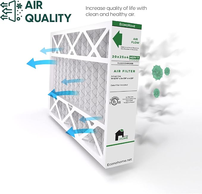 - Excellent Filtration – Our EconoHome air filters will help you breathe cleaner air indoors. This MERV 11 20x25x4 furnace filters helps catch most airborne particles (lint, fine dust, pet dander, smoke, and more) without impacting the airflow in your home.