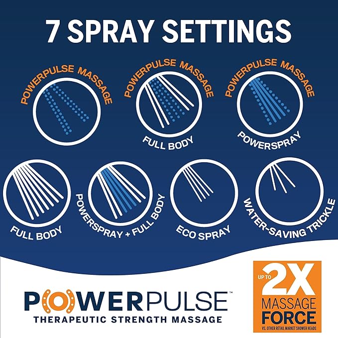 - 7 SPRAY MODES AND 5-FOOT METAL HOSE: Customize your shower experience with a 4-inch shower face and 7 spray options, including our patented PowerPulse therapeutic-strength massage spray that provides up to 2X the massage force vs. other retail market shower heads. The flexible 5-foot (60-inch) stainless steel hose adds convenience for bathing children or pets and makes shower cleaning easy.