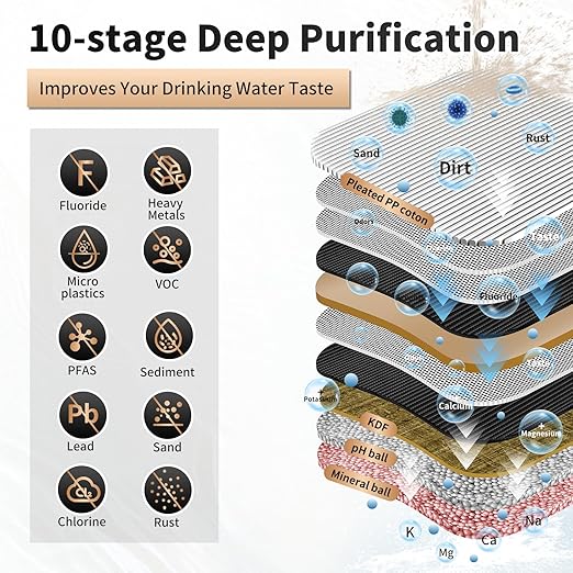 - [3-Stage 10-Layer Filtration]: The under sink water filtration system reduces 99.99% Lead, Chlorine, Odor, Sand, Rust, Benzene, Cyst, P-Dichlorobenzene, Asbestos, MTBE, TTHM, VOC, Turbidity, etc.; Fit for both municipal water and well water; ★NOT for reducing TDS★