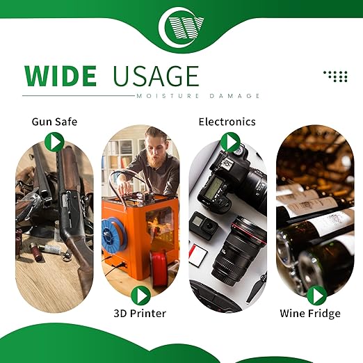 - 【Multi Application】: Portable desiccant canister contains moisture indicating silica gel Beads. You can use these desiccants in a few safes, closed space to control humidity. Such as safe, ammo cans, ammo boxes, tool box, 3d printer filament sealed plastic storage box, weapon case, closet and gives for storing items long-term as for guns, important papers, legal papers, collectibles, books, jewelry, camera lens, expensive camera equipment, photo equipment.