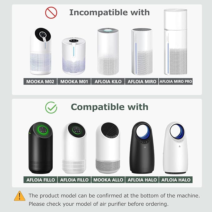 - 【ATTENTION】: Our fillo replacement filter are not compatible with MOOKA M01, M02, not compatible with Afloia HEPA Mini, not compatible with Asukro, not compatible with Afloia MIRO, MIRO-PRO, KILO, check your puri-fier model at the bottom of the machine