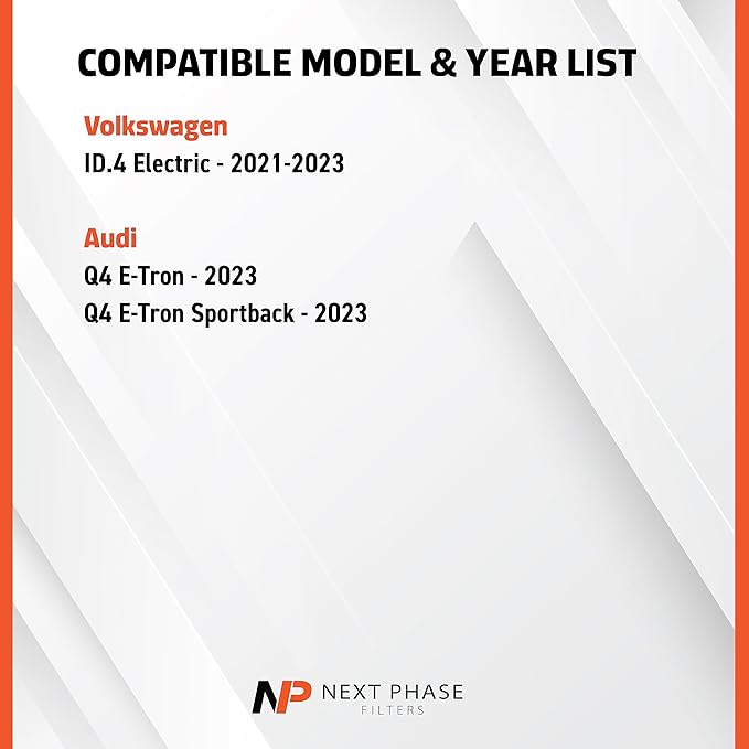 - Pack of 1 Cabin Filter Compatible with - 2021-2023 Volkswagen ID.4 Electric, 2023 Audi Q4 E-Tron & Q4 E-Tron Sportback, our carbon cabin filters are designed to fit perfectly in your vehicle. Next Phase NP81966 replaces O.E. 1EA819669.