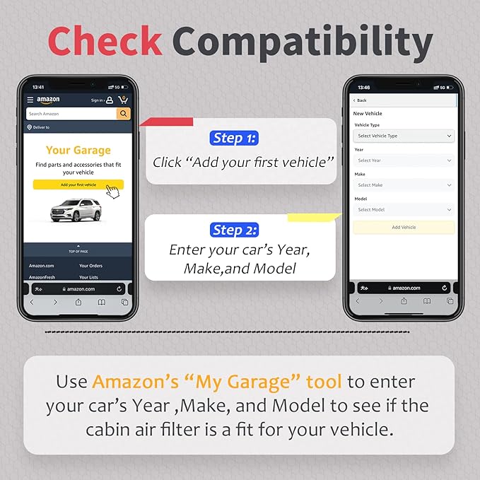 - Check Compatibility: Use Amazon's "My Garage" tool to enter your car's Year, Make, and Model to see if the cabin air filter is a fit for your vehicle