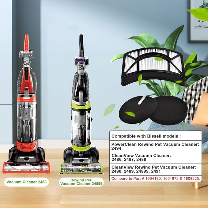 - COMPATIBILITY: The filter replacement are fit for Bissell CleanView 2486, 2487, 2488, 2492, CleanView Rewind Pet 2490, 2489, 24899, 2491, PowerClean Rewind Pet 2484 Vacuum. Replace Part 1604130, 1601972, 1608225
