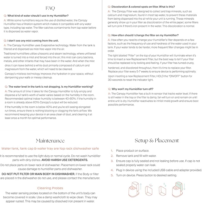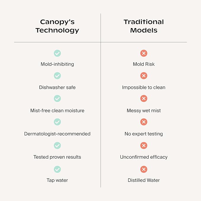 - THE CANOPY BRAND PROMISE - 60 DAY GUARANTEE - We are driven by the quality of our products and our commitment to creating reimagined household devices that effortlessly optimize the home for beauty and wellness. Every Humidifier comes with our state of the art technology and design - an experience only found with Canopy. Not only will our humidifier help you improve your health, skin, and sleep quality; it will help you unwind, relax and destress after a long day.