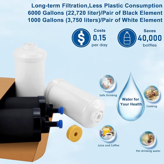 - 【Compatible - Perfect Match】The black purification elements and white fluoride filters fit perfectly with the original brand. The filter elements are compatible with the original brand with the Big, Royal, Impe.rial and Cro.wn gravity water filtration systems. And it is also compatible with Water-drop,Pure-well, FACH-IOO Gravity Water Filter System (If there is any uncertainty about the brand and model, you can consult us at any time)