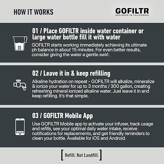 - NEW GOFILTR MOBILE APP β Achieve your hydration goals with the GOFILTR Hydration Assistant! Activate and track your infuser refills while receiving smart water reminders that keep you drinking throughout the day. With bottle cleaning alerts and replacement notifications, staying hydrated has never been easier or more effective!